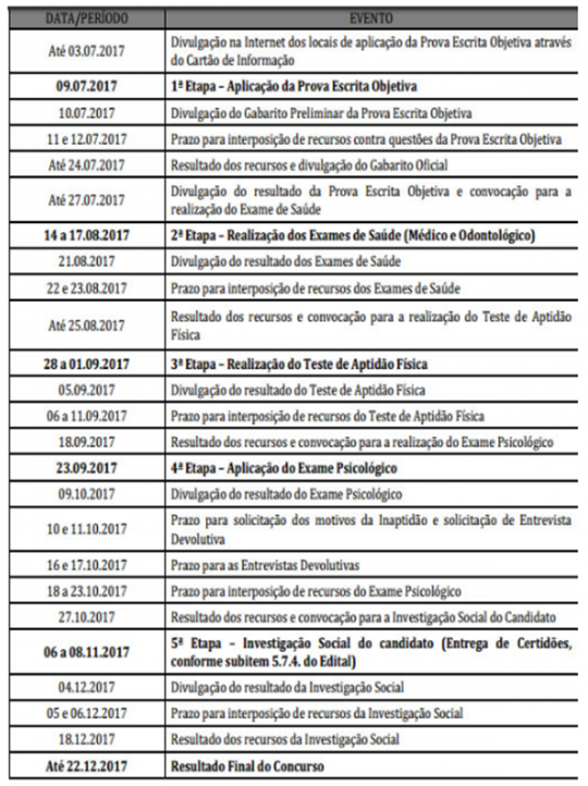 No período de 28 de agosto a 1º de setembro será realizado o teste de aptidão física. Na quarta etapa será realizado o teste psicológico, no dia 23 de setembro e de 06 a 08 de novembro acontecerá a investigação social do candidato.
