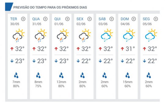 Na terça-feira, a temperatura máxima sobe para 32º. A mínima não passa dos 23º. Pela manhã acontece aumento de nuvens e pancadas de chuva durante tarde e noite. A estimativa de precipitação é de 80%. Já na quarta-feira haverá chuva rápida durante o dia e a noite. A máxima fica em 32º e mínima de 23.