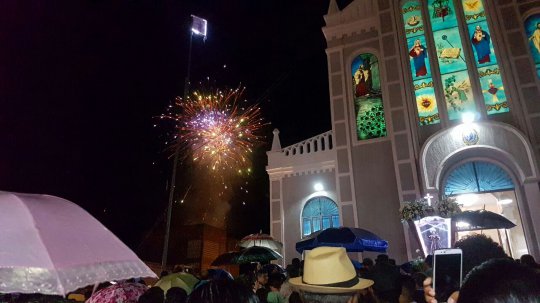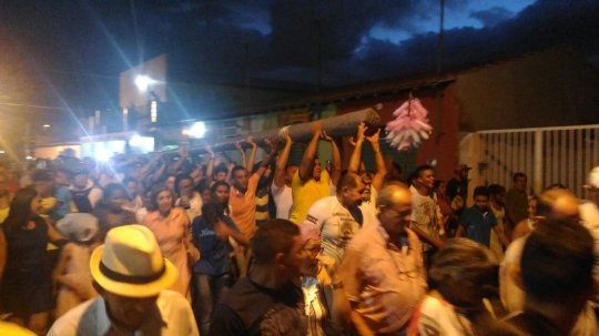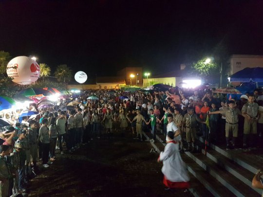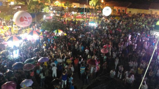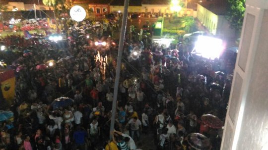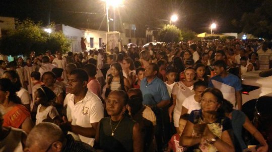 A multidão chega a praça Bona Primo. As pessoas se desloca agora para o adro da Igreja onde acontece a fala de lideranças religiosas e política, o hasteamento do mastro e a queima de fogos.