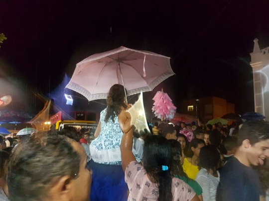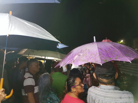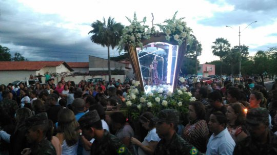 A imagem de Santo Antônio cruza chega agora próximo ao Fórum. Uma leve chuva cai em Campo Maior neste momento. Os fiéis seguem a procissão mesmo com a chuva.