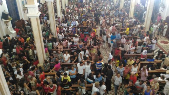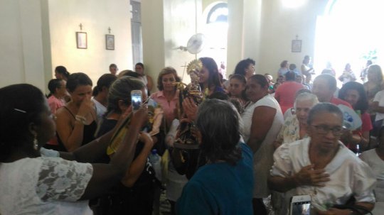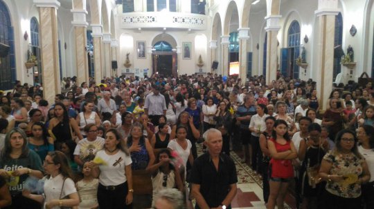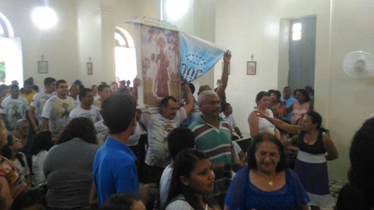 A imagem do santo casamenteiro adentra a Catedral. O local é pequeno para a grande quantidade de fiéis que aguardam a chega da imagem de Santo Antônio.
