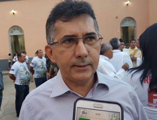 O prefeito de Campo Maior Professor Ribinha fala neste momento à multidão. O gestor lembra da parceira entre Igreja e o município para a realização das atividades religiosas e social.