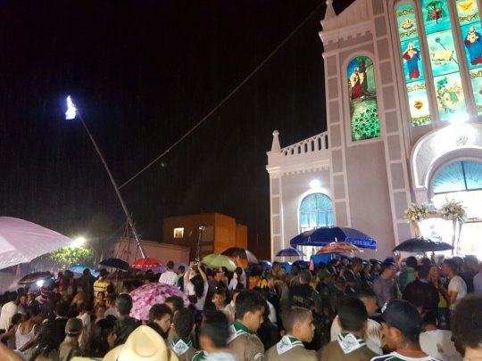 A chuva volta a cair sobre os fiéis. No momento que chega a Catedral a imagem de Santo Antônio. Uma multidão ainda segue o trajeto, que já dura mais de uma hora.