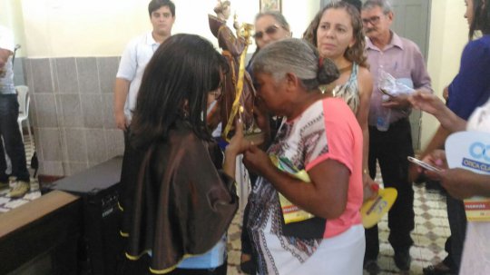 Onde a procissão passa, fiéis católicos saldam Santo Antônio.