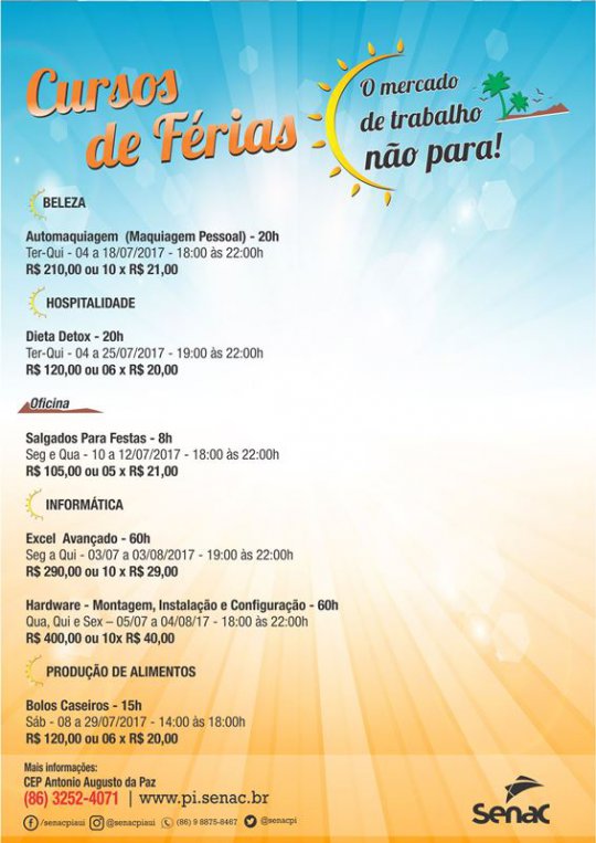 O Senac está com matrículas abertas para cursos de férias em todas as unidades do Piauí. Estão sendo ofertadas mais de 150 opções de cursos, oficinas e workshops, que serão realizados entre o período de 26 de junho a 06 de agosto de 2017, com vagas limitadas.