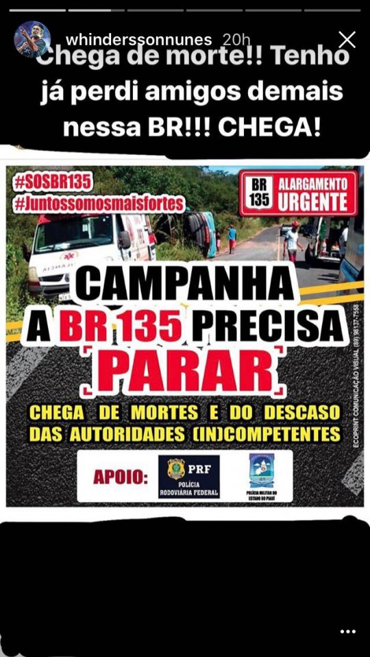 O youtuber piauiense Whindersson Nunes publicou em uma de suas contas nas redes sociais um protesto em forma de desabafo por causa das mortes na BR-135. O comediante, que possui mais de 20 milhões de inscritos em seu canal na internet, é natural da cidade de Bom Jesus, localizada a 150 km de Monte Alegre do Piauí, onde aconteceu um acidente que matou nove pessoas e deixou 18 feridos no último sábado (17).