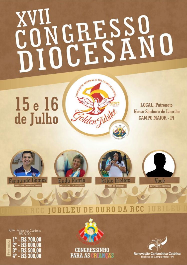 A Renovação Carismática Católica da Diocese de Campo Maior se prepara para o seu XVII Congresso Diocesano, que acontecerá nos dias 15 e 16 de julho em Campo Maior no Patronato Nossa Senhora de Lourdes. Neste ano, vamos celebrar o Jubileu de ouro da RCC no mundo. Assim vivemos o tempo da graça jubilar que, além de fazermos memória de gratidão desses 50 anos, somos impulsionados pelo Espírito Santo a prosseguir com esperança rumo a meta que é Nosso Senhor Jesus Cristo.