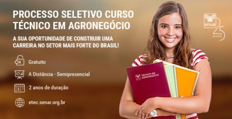 O Serviço Nacional de Aprendizagem Rural – SENAR acaba de abrir processo seletivo para ingresso no curso técnico de nível médio em Agronegócio. O curso, que compreenderá 2017/02 está sendo oferecido na forma subsequente e na modalidade a distância, o que facilita o ingresso de alunos trabalhadores.
