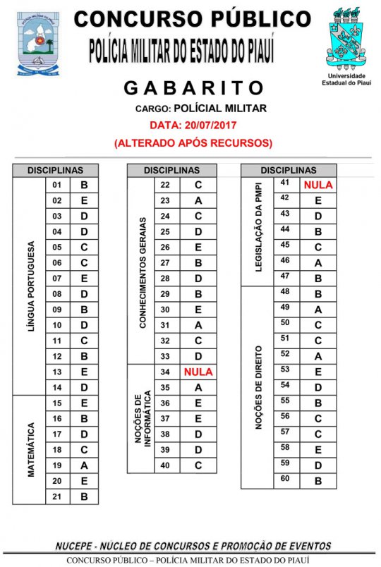 O Núcleo de Concursos e Promoção de Eventos (Nucepe) da Universidade Estadual do Piauí (Uespi) decidiu anular duas questões da prova escriva objetiva do concurso público da Polícia Militar. Um novo gabarito foi divulgado, nesta segunda-feira (24), com as questões anuladas.