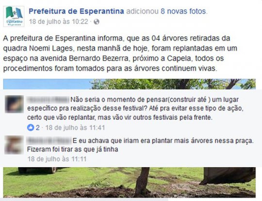 "Meu Deus, logo eu que ajudei a plantar essas árvores, que vergonha prefeita, desse jeito você vai acabar com a nossa cidade", declarou outro.A página da prefeitura de Esperantina em uma rede social também foi alvo da revolta dos moradores, que desaprovaram a retirada das árvores na praça e cobraram das autoridades a execução de medidas que não prejudiquem o meio ambiente.