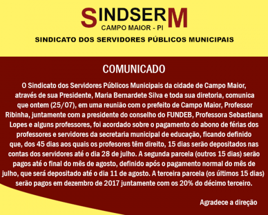 Na noite do dia 25 deste mês, a professora e presidente do SINDSERM, Bernardete Silva, juntamente com a presidente do conselho do FUNDEB, Sebastiana Lopes, e demais professores, estiveram em reunião com o prefeito de Campo Maior, Professor Ribinha, tratando do abono de férias destinado aos professores e servidores da secretaria municipal de educação.