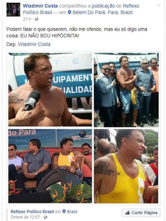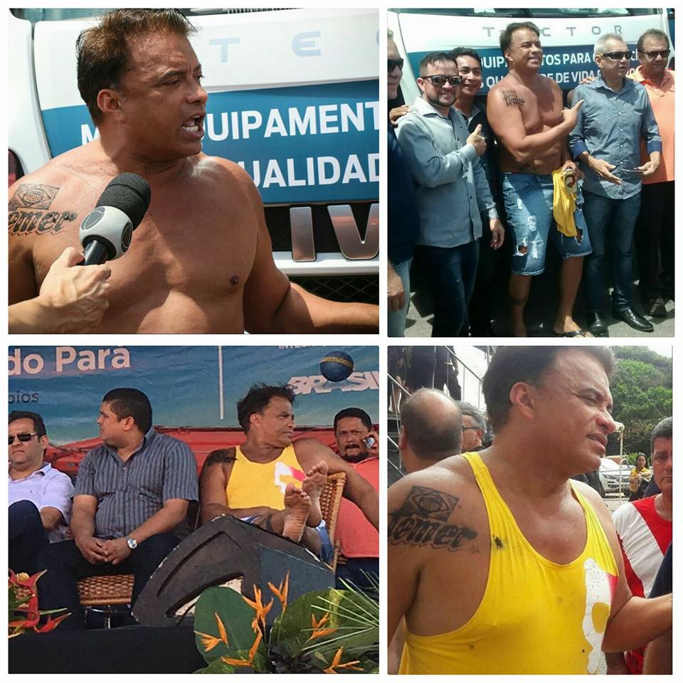 O deputado Wladimir Costa (SD-PA) divulgou neste fim de semana nas redes sociais imagens de um evento em Salinas (PA) no qual aparece sem camisa e com a inscrição “Temer” tatuada no ombro direito. Acima do nome do presidente, há uma bandeira do Brasil.