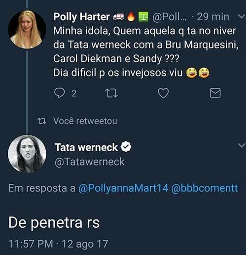 A atriz Tatá Werneck contou nas redes sociais que a ex-BBB Emilly Araújo apareceu sem convite em sua festa de aniversário realizada na noite deste sábado, 12.