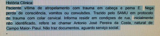 “Paciente vítima de atropelamento com trauma em cabeça e perna. Nega perda de consciência, vômito e convulsão. Trazido pelo Samu em protocolo de trauma com colar cervical. Informa residir em condições de rua, inicialmente não identificado. Refere-se chamar Antônio José Pereira da Costa, natural de Campo Maior-PI”, relata o histórico clínico do paciente.