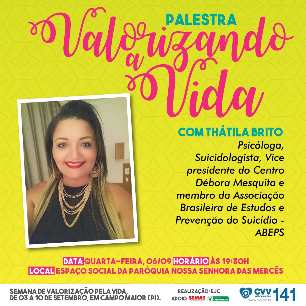 Uma das primeiras ações destinadas às campanhas do Setembro Amarelo será uma enriquecedora palestra com o tema Valorizando a Vida com a especialista Thátila Brito que é psicóloga, suicidologista, vice-presidente do centro Débora Mesquita e membro da Associação Brasileira de Estudos e Prevenção ao Suicídio - ABEPS.