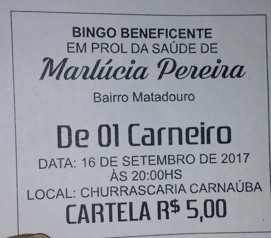 Por isso, familiares e amigos de Marlúcia estão organizando um bingo e leilão beneficente em prol de sua saúde. O evento acontecerá no dia 16 de setembro na churrascaria Carnaúba, em frente à praça de eventos, às 20h00min.