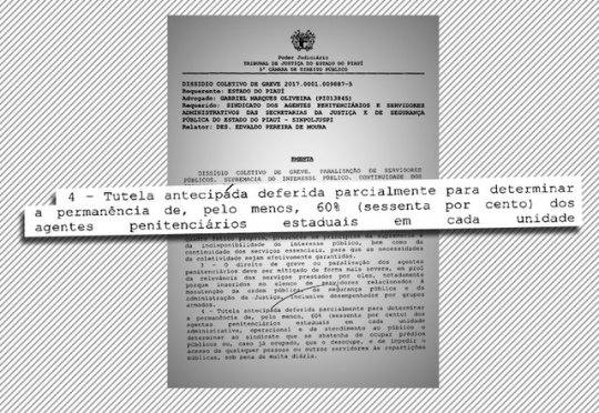 Na decisão, o magistrado observa que a paralisação, ao não garantir o contingente mínimo de agentes e a regularidade das atividades nos presídios, implica em violação à ordem e à segurança públicas e à efetiva prestação jurisdicional.Presídio inaugurado de forma emergencialmente