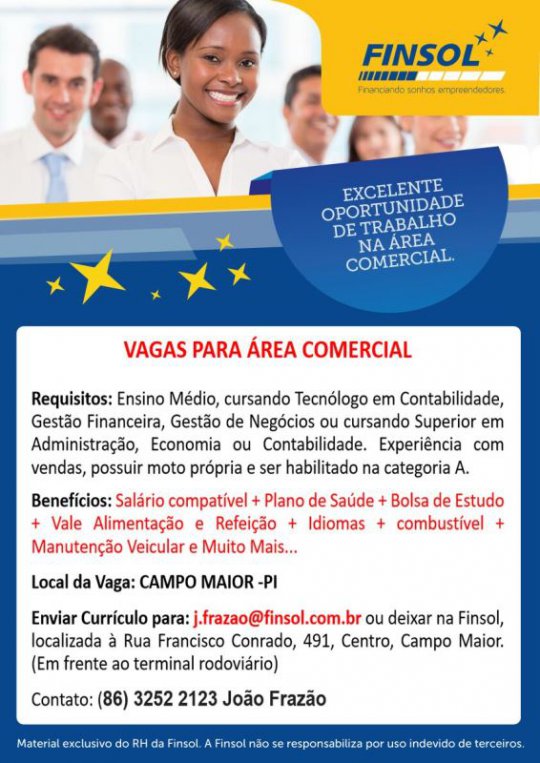 A Finsol Microcrédito está recebendo currículos para selecionar pessoas para trabalhar na área comercial da empresa em Campo Maior. O cargo oferece salário compatível, plano de saúde, bolsa de estudo, vale alimentação e refeição, idiomas, vale combustível, manutenção veicular entre outros benefícios.