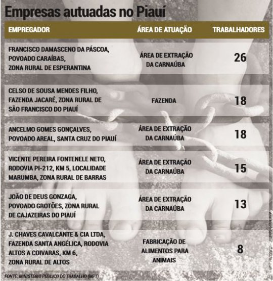 Segundo os dados, 98 empregados foram resgatados pelas equipes de fiscalização em situação degradante de trabalho desde então. A maioria deles trabalhava na extração de palha de carnaúba e em fazendas. Ainda de acordo com os dados do MPT no Piauí, a quantidade de trabalhadores resgatados vinha experimentando um crescimento significativo nos últimos anos, mas voltou a cair em 2016. Em 2012, por exemplo, era uma média de 16,5 trabalhadores resgatados por operação, no Piauí. Em 2015, esse número chegou à 24, mas voltou a cair em 2016, chegando a 16,75.