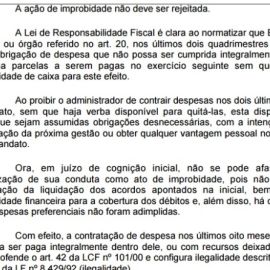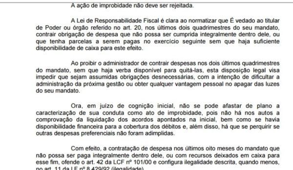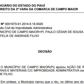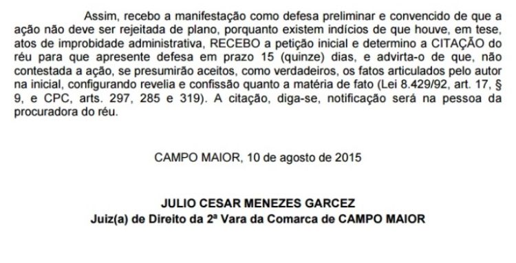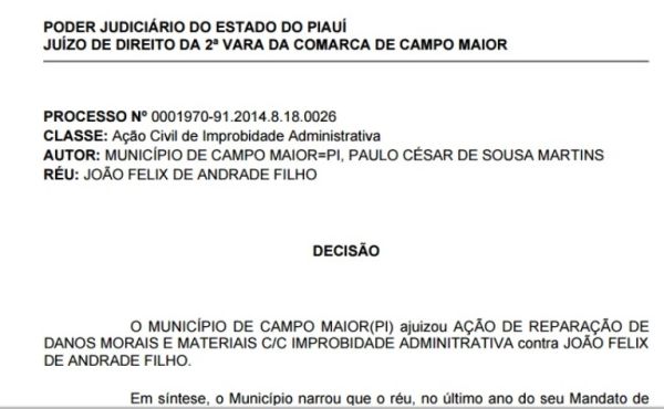 O problema ? que a LRF ? clara ao proibir que gestores deixem d?vidas para gestores futuros. Por conta disso, o juiz J?lio Cesar Menezes Garcez da 2? vara da comarca de Campo Maior acatou a manifesta??o declarando que existem ind?cios de que houve, em tese, atos de improbidade administrativa. Ele determinou a cita??o do r?u para que apresente defesa. Caso Jo?o F?lix n?o se explique, o caso ser? julgado ? revelia.