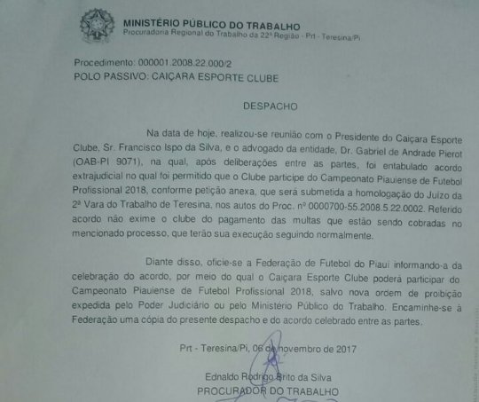 A autorização concedida ao Caiçara foi assinada pelo procurador Ednaldo Brito e não exime o clube do pagamento das multas estipuladas, mas concede o direito de disputar competições locais a partir de 2018. O clube teve suas atividades suspensas pela Justiça do Trabalho por conta de débitos relacionados à multa por suposta exposição de jogadores à condições análogas à escravidão. A diretoria alvirrubra negou a denúncia à época.