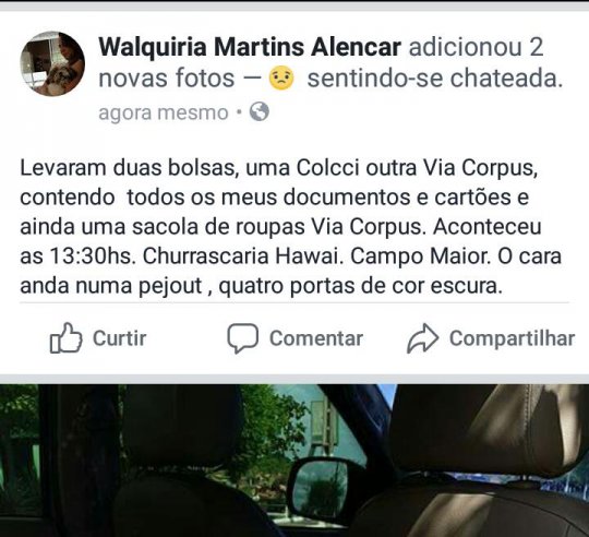 A empresária Walquiria Martins, dona de uma das maiores empresas de Jeans da região nordeste do Brasil, e esposa do ex-prefeito Paulo Martins, teve seu carro arrombado e seus pertences roubados na tarde de hoje, 09 de novembro, enquanto almoçava em um restaurante de Campo Maior.
