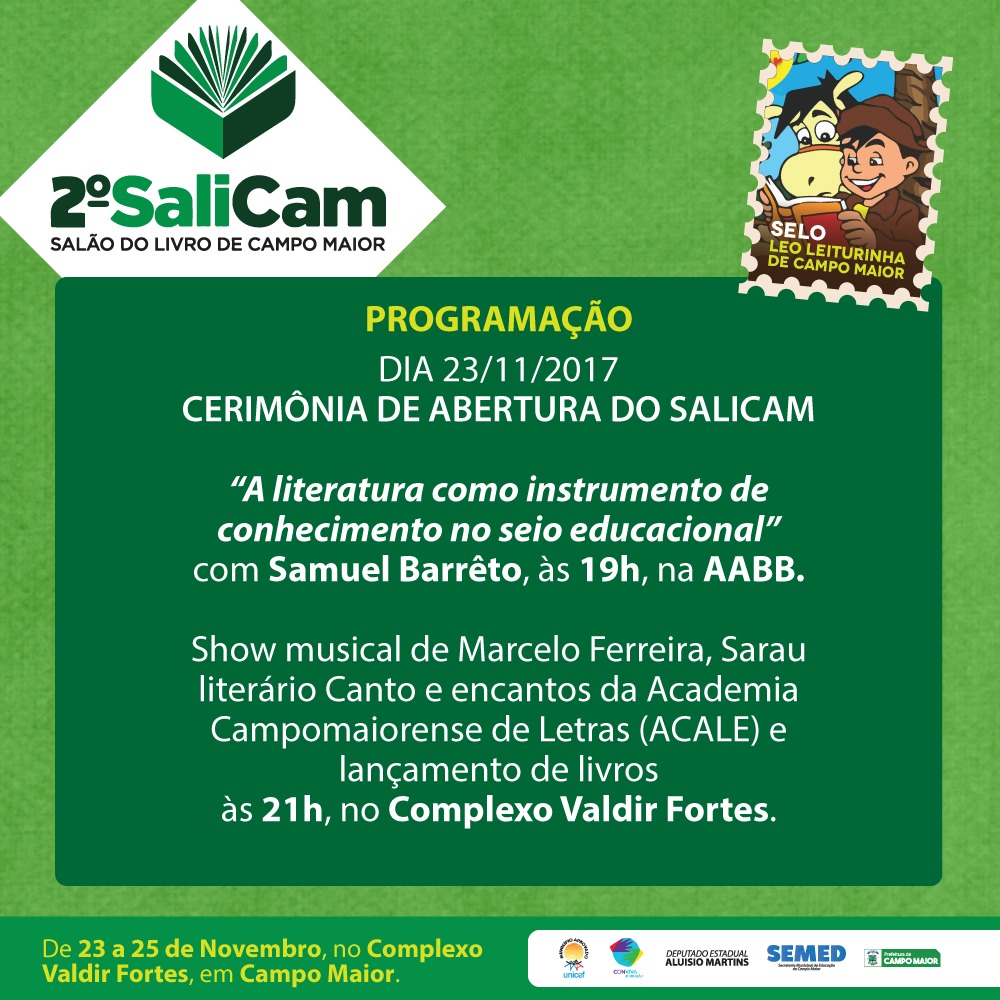 O 2º Salão do Livro de Campo Maior (SALICAM) tem início na próxima sexta-feira (23/11) e segue até o domingo (25/11). A programação do evento literário conta com palestras, bate papo literário, shows, comercialização e lançamento de livros e atividades do projeto Léo Leiturinha.