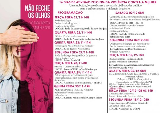 A campanha “16 dias de ativismo pelo fim da violência contra mulher” promove uma extensa programação em Campo Maior até o dia 18 de dezembro. Palestras, mesas redondas, diálogos em escolas, audiência pública e capacitação de profissionais da área de segurança integram as atividades da campanha.