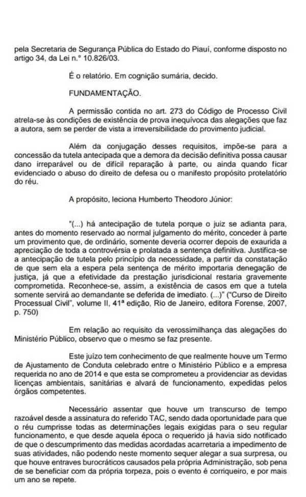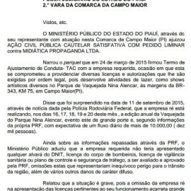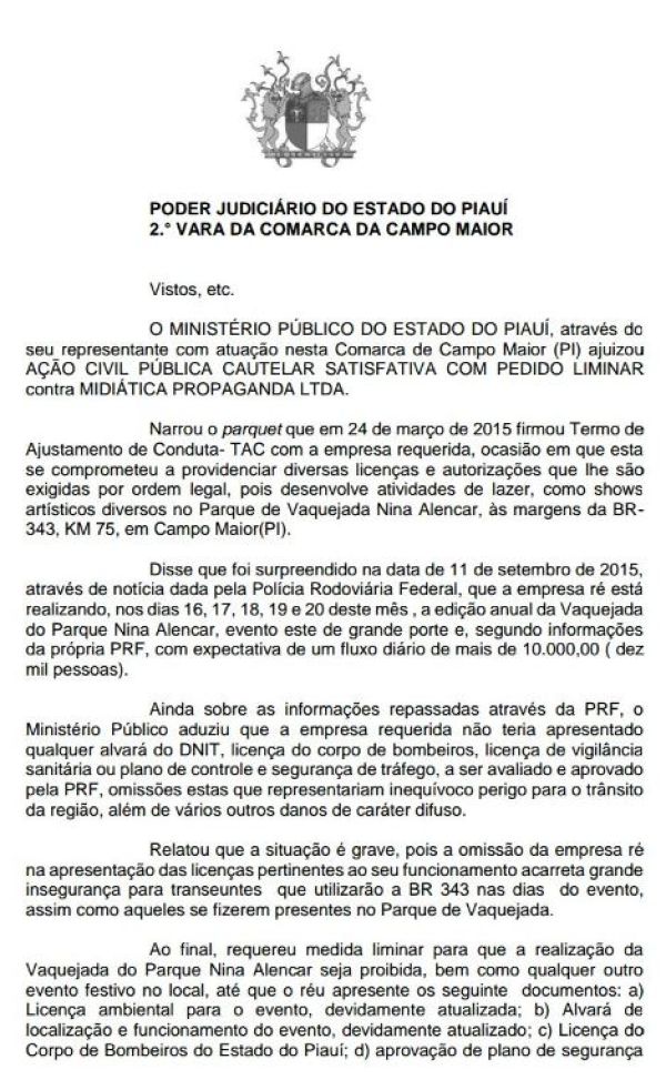 A vaquejada do Parque Nina Alencar estava prevista para começar nesta quinta-feira (17/09), porém foi suspensa por conta de uma liminar do Juiz Júlio Cesar Menezes Garcez que alegou falta de licenças essenciais para este tipo de evento como licença ambiental, alvará de localização e funcionamento, licença do corpo de bombeiros, aprovação do plano de segurança pela Secretaria de Segurança do Piauí, aprovação do plano de controle e segurança de tráfego pela Polícia Rodoviária Federal (PRF) e Alvará do Departamento Nacional de Infraestrutura Terrestre (DNIT).