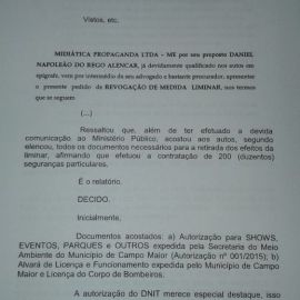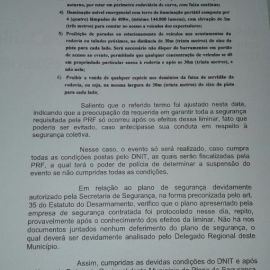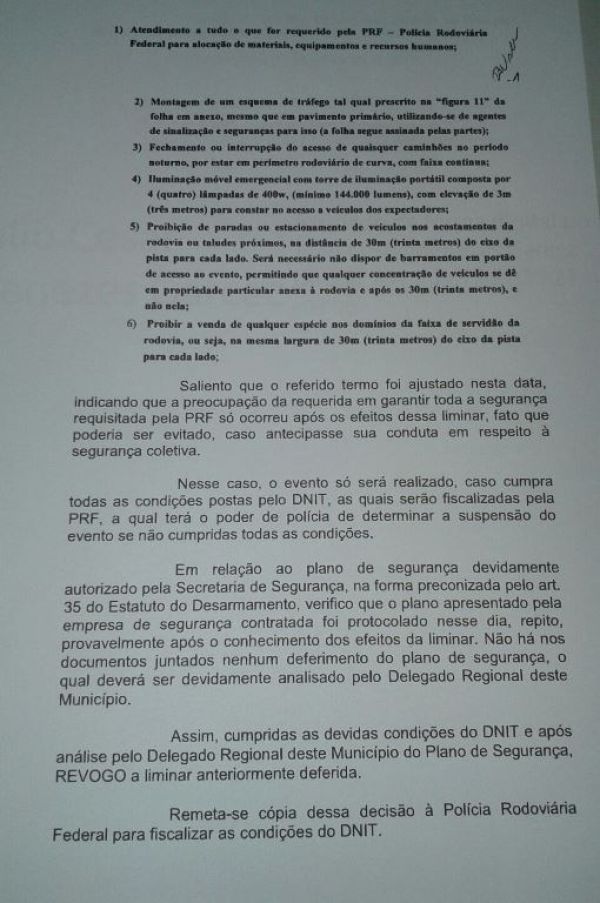 “Saliento que o referido termo foi ajustado nesta data, indicando que a preocupação da organização do evento em garantir toda segurança requisitada pela PRF só ocorreu após os efeitos dessa liminar, fato que poderia ser evitado caso antecipasse sua conduta em respeito a segurança da coletividade”, disse o juiz na decisão de revogação.