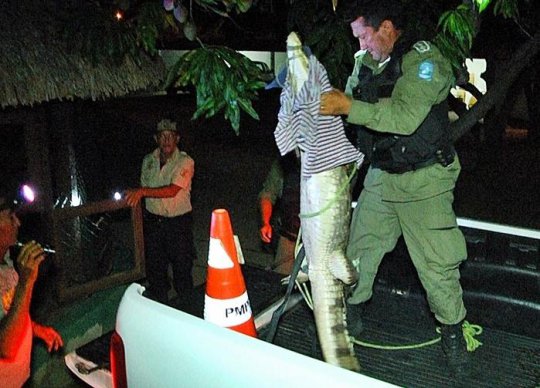 "A casa em que o réptil foi encontrado fica próximo a uma lagoa. A moradora percebeu a presença dele no quintal e acionou a polícia. Ele deveria estar procurando se alimentar, com um galinha, uma presa fácil. Ele foi amarrado e retirado de lá”, informou o tenente Mesquita da CIPTur.