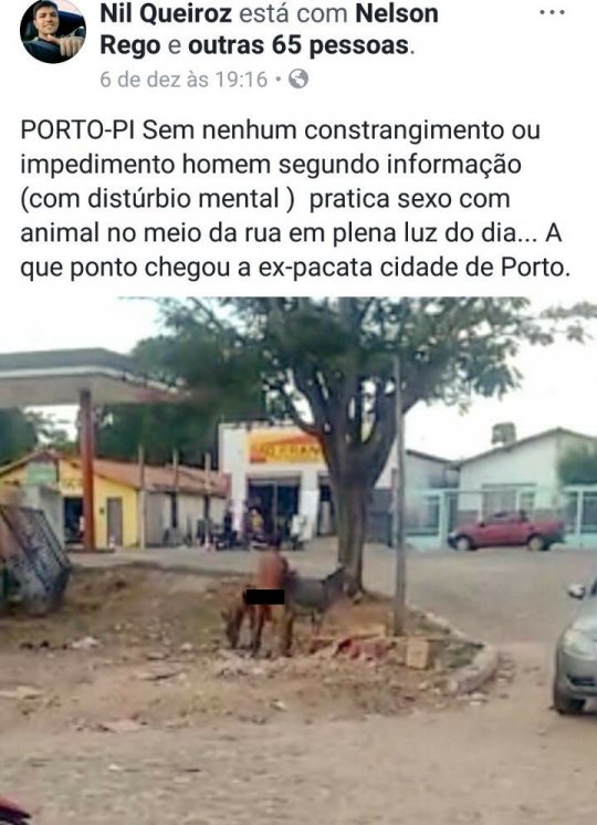 Um homem que teria transtornos mentais foi filmado praticando zoofilia (sexo com animais) com um jumento no meio da rua na cidade de Porto-PI (134 km ao norte de Teresina). O vídeo foi divulgado nas redes socias por Nil Queiroz (Nilson Rêgo). "Sem nenhum constrangimento ou impedimento homem segundo informações com distúrbio mental, pratica sexo com animal no meio da rua em pela a luz do dia. A que ponto chegou a ex-pacata cidade de Porto" escreveu na postagem.
