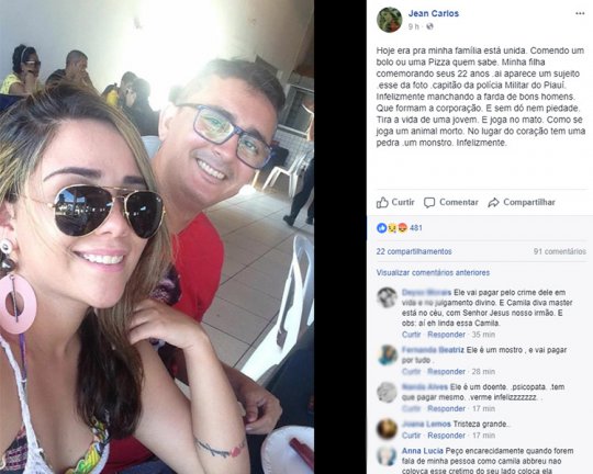 "Hoje era pra minha família está unida. Comendo um bolo ou uma pizza quem sabe. Minha filha comemorando seus 22 anos. Aí aparece um sujeito, esse da foto, capitão da Polícia Militar do Piauí, infelizmente manchando a farda de bons homens que formam a corporação. E sem dó nem piedade tira a vida de uma jovem e a joga no mato como se joga um animal morto. No lugar do coração tem uma pedra. Um monstro, infelizmente", postou o pai de Camilla.