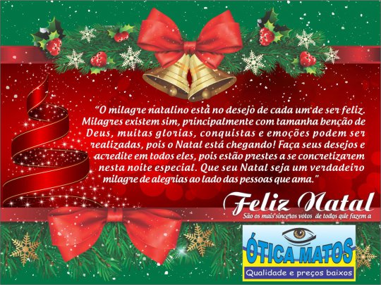O ano inteiro a Ótica Matos esteve com as melhores opções, lhe recebendo com o melhor atendimento e compartilhando com você momentos incríveis. Neste fim de ano é o momento de renovar nossa amizade. Feliz Natal e Prospero ano novo.