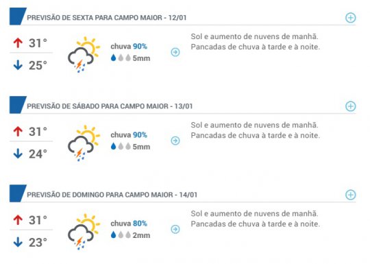 No sábado (13/01) o sol aparece entre nuvens pela manhã. O dia começa com frio de 24°C. A temperatura sobe para 31°C nos demais horários e volta a cair à noite. Há 90% de chance de chuva.