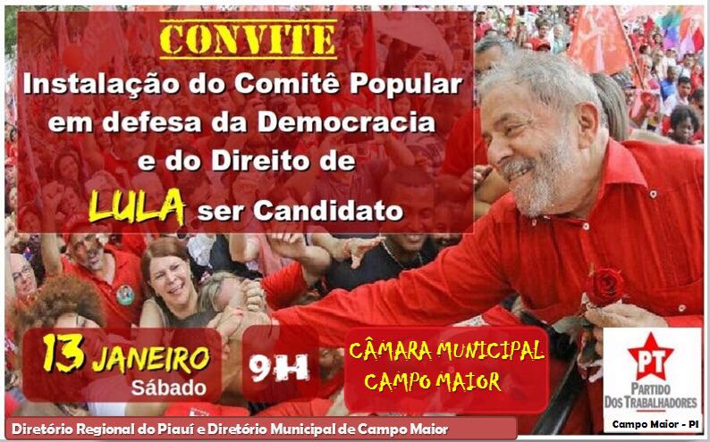 O Partido dos Trabalhadores realiza na manhã desta sábado (12), em Campo Maior, um ato em defesa do ex-presidente Lula. Durante o evento acontece a “Instalação de um comitê popular em defesa da democracia e do direito de Lula ser candidato”.