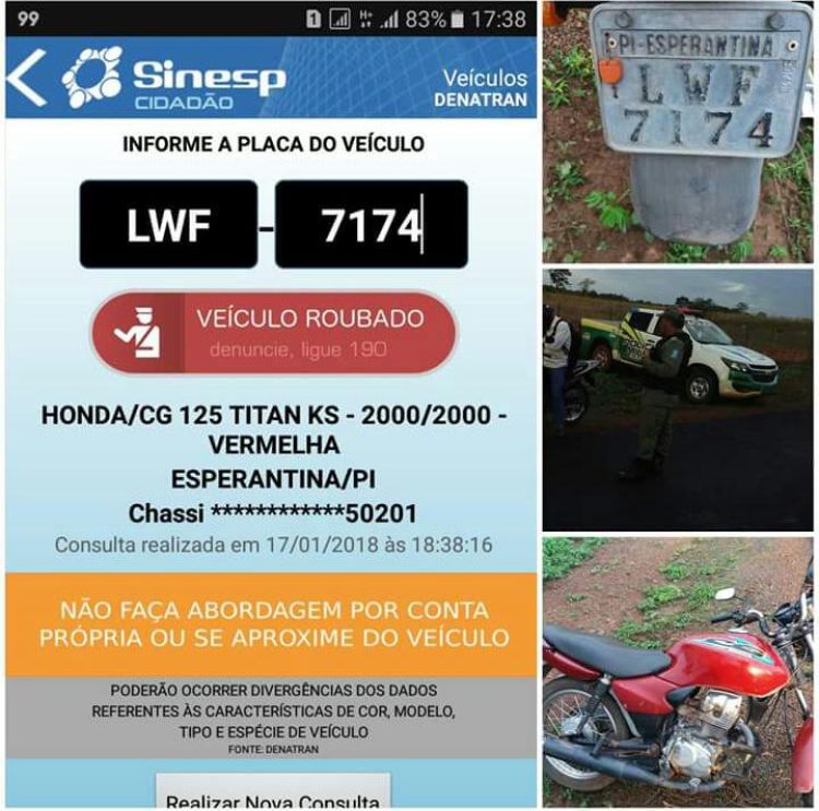 “Durante blitz realizada na estrada que liga Barras a Miguel Alves, a guarnição abordou José de Paula Sousa e ao consultar a placa LWF 7174 da motocicleta titan ks cor vermelha, foi constatada a restrição para roubo/furto. A motocicleta e o condutor foram conduzidos para a Delegacia de Policia Civil para os procedimentos legais”, informou o comandante.