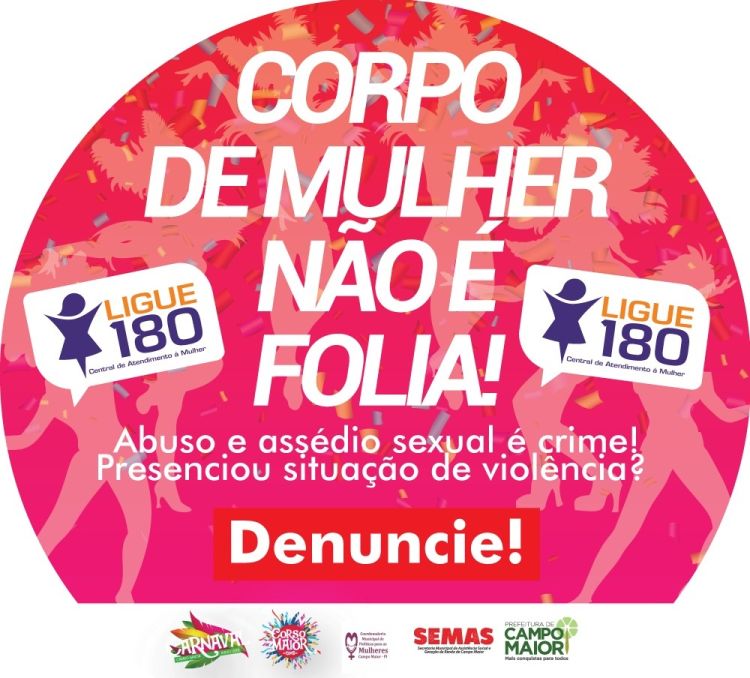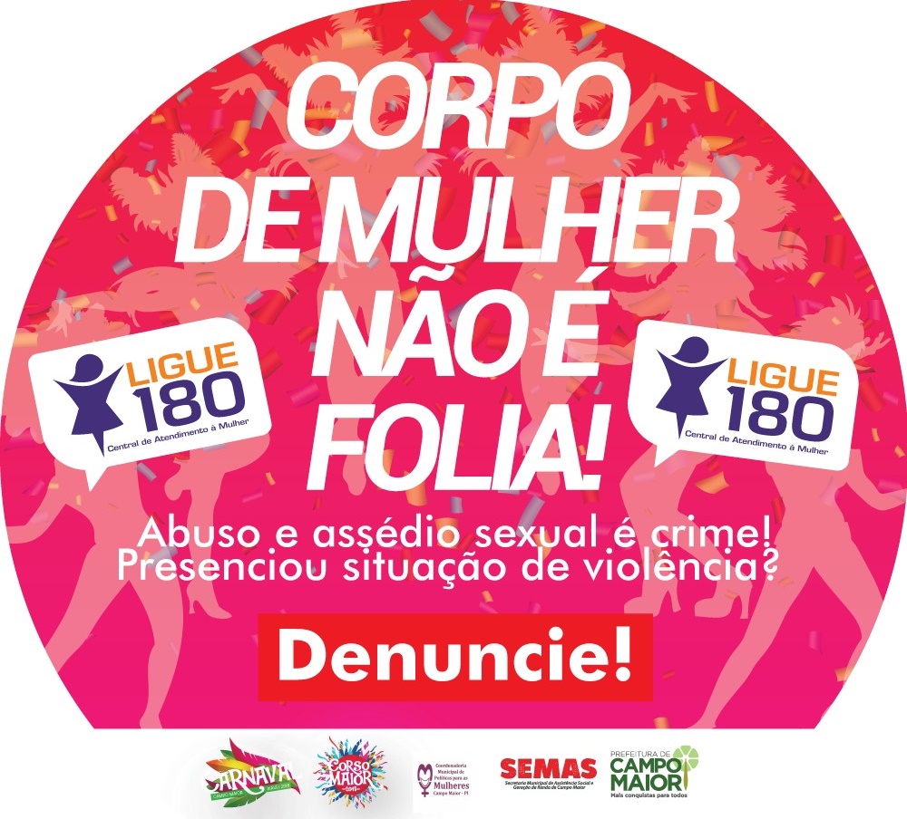Os responsáveis pela campanha também fazem um apelo para que as mulheres que se sintam de alguma forma assediadas, seja sexualmente, moralmente ou qualquer outra forma, procurem imediatamente a central de atendimento à mulher por meio do número 180 que pode ser ligado de qualquer aparelho celular ou fixo. A ligação é gratuita e ajudará a manter o carnaval em Campo Maior seguro e livre de abusos, bom para todos!