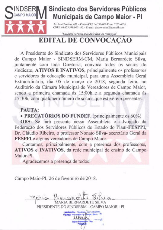A presidente do Sindicato dos Servidores Públicos Municipais de Campo Maior – SINDSERM – CM, Maria Bernardete Silva, juntamente com toda a sua diretoria convoca todos os sócios do sindicato, ATIVOS E INATIVOS, principalmente os professores e servidores da educação municipal, para uma Assembleia Geral Extraordinária, dia 05 de Março de 2018, segunda-feira, no auditório da Câmara Municipal de Vereadores de Campo Maior, sendo a primeira chamada às 15h00min e a segunda às 15h30min, com qualquer número de sócios que estiverem presentes.
