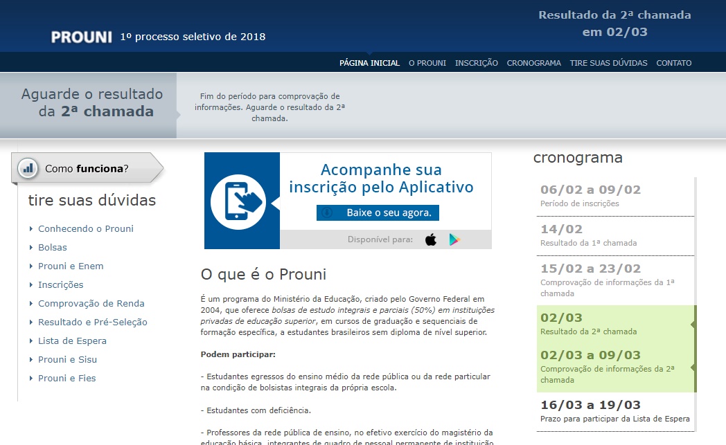 Hoje (02) deve ser divulgada a segunda chamada do Programa Universidade para Todos (Prouni). O resultado será disponibilizado no site do Prouni. Os candidatos também poderão consultar a lista pelo aplicativo do Programa para celular e tablets.