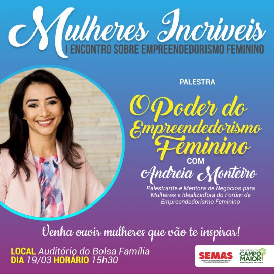 Sabendo do potencial feminino e da importância do papel da mulher para uma sociedade mais justa e igualitária, a prefeitura de Campo Maior promoverá hoje (19/03) às 15h30 uma palestra sobre o poder do empreendedorismo feminino com a palestrante e mentora de negócios para mulheres e idealizadora do Fórum de empreendedorismo, Andreia Monteiro.