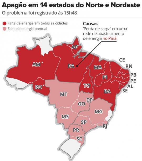 Municípios de ao menos 14 estados do Norte e do Nordeste do país enfrentaram um apagão nesta quarta-feira (21): Alagoas, Amapá, Amazonas, Bahia, Ceará, Maranhão, Pará, Paraíba, Piauí, Pernambuco, Rio Grande do Norte, Rondônia, Sergipe e Tocantins.