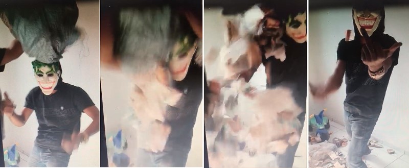 Nas imagens o suspeito aparece com uma máscara do vilão Coringa e uma outra pessoa segura um saco sobre sua cabeça, que abre e de dentro caem diversas notas de dinheiro. Em seguida, ele mostra o dedo do meio para a câmera. Segundo a Secretaria de Segurança, as cédulas que aparecem nas imagens foram roubadas nessa quarta-feira (21) do Banco do Brasil de Inhuma, Sul do Piauí.