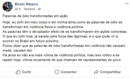 Em sua página no Facebook, Efrém falou sobre a agressão, mas não citou o nome do agressor.