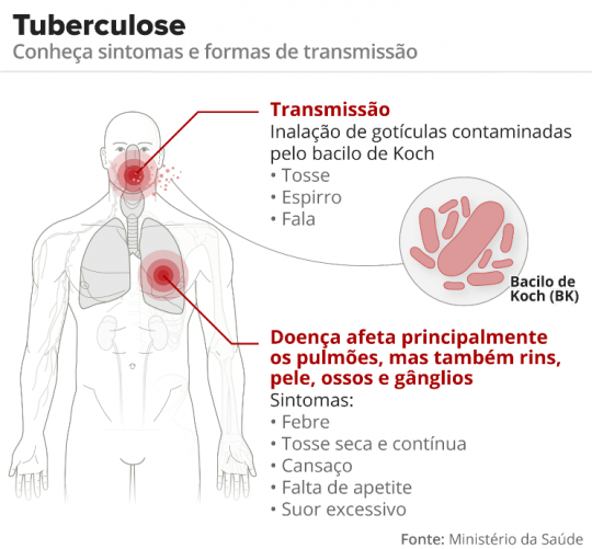 "É o mesmo bacilo da tuberculose pulmonar. A pulmonar é apenas o tipo mais frequente de apresentação da tuberculose, com 85% dos casos. De uma forma geral, é uma bactéria que dá em todos os órgãos: pulmão, coração, pleura e também nos gânglios".