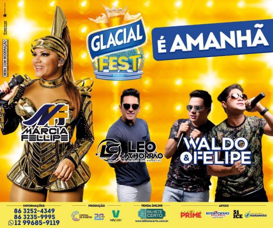 A cidade de Campo Maior recebe amanhã, sexta-feira (20/04), uma das etapas da 8ª edição do ‘Glacial Fest 2018’, evento já consolidado em todo o Brasil. O evento, que acontece pela primeira vez em Campo Maior, traz artistas como Márcia Felipe, Leo Cachorrão e Waldo & Felipe e DJs. O evento acontece no Iate Clube.