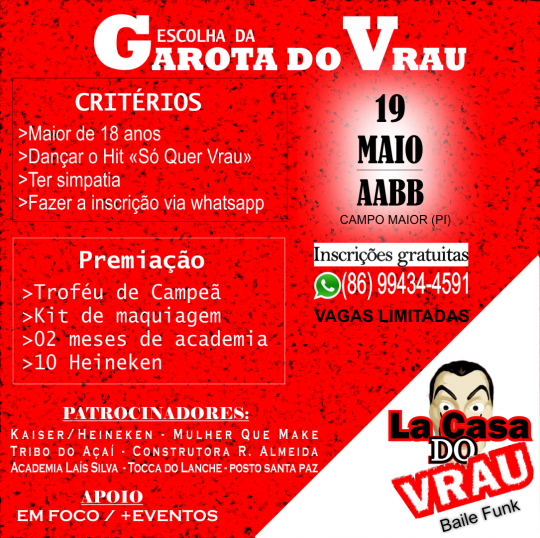 O evento fará a escolha da Garota do Vrau que terá que se apresentar dançando a coreografia da música “Só Quer Vrau”. A decisão será feita pelo público presente. A vencedora receberá troféu, um kit de maquiagens da Mulher Que Make, dois meses de academia na Academia Laís Silva e 10 cervejas Heineken.
