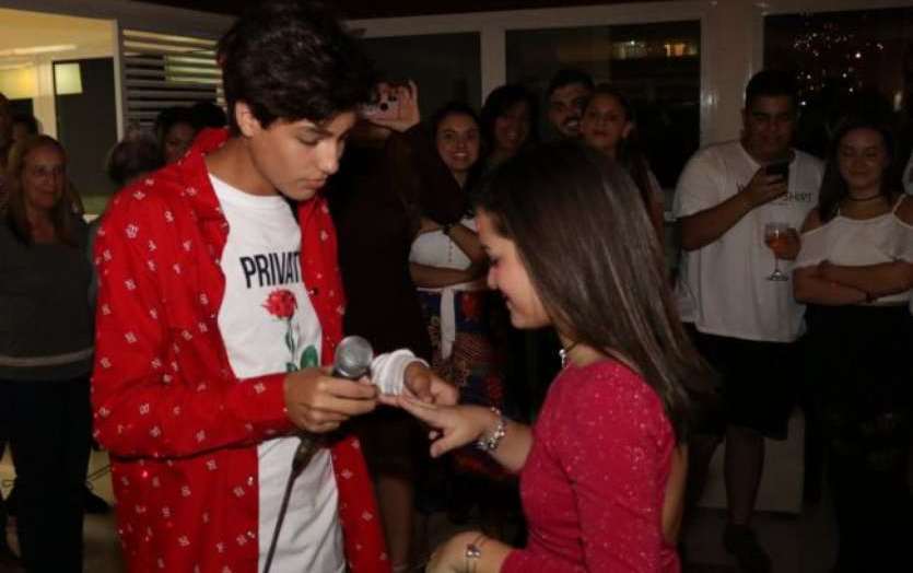 Mel Maia completou 14 anos na última quinta-feira (06) e comemorou a data com uma festa de pijama entre amigas. Mas, na noite deste sábado (05), a atriz de "Deus Salve o Rei" -trama na qual vive Agnes - ganhou uma festa surpresa em condomínio na Zona Norte do Rio de Janeiro. Ao chegar no local, a adolescente se emocionou e ainda ganhou uma declaração do namorado, Erick Andreas, de 14 anos de idade. Além da mensagem carinhosa, Mel recebeu também um anel de compromisso de Erick. Em seu Instagram Stories, Erick brincou sobre o mimo dado à atriz. 'Casamos', legendou ele, mostrando o presente em detalhes.