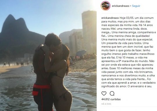 "Hoje, um dia comum para muitos, mas pra mim, um dos dias mais especiais da minha vida. Há 14 anos nasceu Mel, uma menina linda, doce, meiga... Uma menina amiga, companheira e fiel... Uma menina cheia de qualidades! Uma menina muito mais do que especial. Um presente da vida para todos. Uma menina que tem um dom incrível, que faz muito bem o que gosta de fazer, tenho orgulho imenso pelo trabalho maravilhoso que ela faz. E há 10 meses, a vida me apresentou a 8ª maravilha do mundo. Não sei por onde ela estava que não apareceu antes. Esses 10 melhores meses da minha vida passei junto com ela, nós brincamos, namoramos e nos divertimos muito, e olha que ainda temos a vida pela frente... Foi com ela que aprendi a amar, e o verdadeiro significado do amor. (...) Te desejo muita felicidade, alegria de sobra e bastante saúde. Que você seja sempre essa pessoa que todos amam. Feliz aniversário!! Eu te amo", escreveu sobre a atriz, que tem o apoio dos pais na relação.