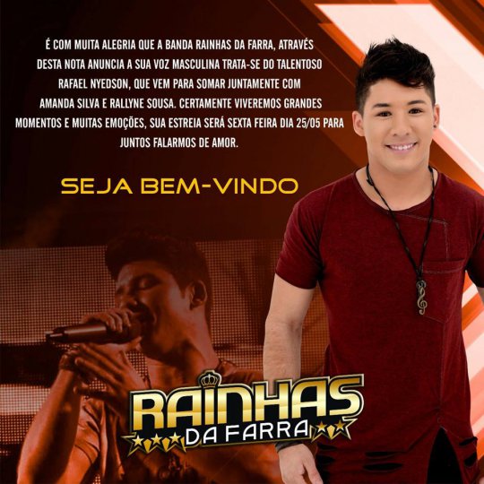 “Olá amigos! É com grande alegria estar anunciando a partir de agora meu retorno aos palcos, logo após meu desligamento da Desejo de Menina. Com grande entusiasmo e com ainda mais vontade, com mais força e coração dizer a todos vocês que fazem parte da minha carreira pessoal e profissional, comunicar que sou o novo vocalista da banda RAINHAS DA FARRA, na qual vou me entregar de corpo e alma ao romantismo, juntamente com minhas companheiras de palco, Amanda Silva e Rallyne Sousa. Desde já, agradeço a direção da banda pela confiança e o apoio a essa nova fase da minha vida. Continue comigo. Deus no comando, sempre!!!!!!!!